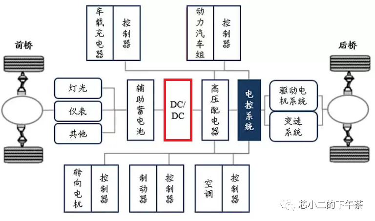 直流-直流变换器: 将高压直流电降压为12V/24V低压直流电,为车辆低压系统(灯光、音响、仪表、控制器等)供电,并为低压蓄电池充电。