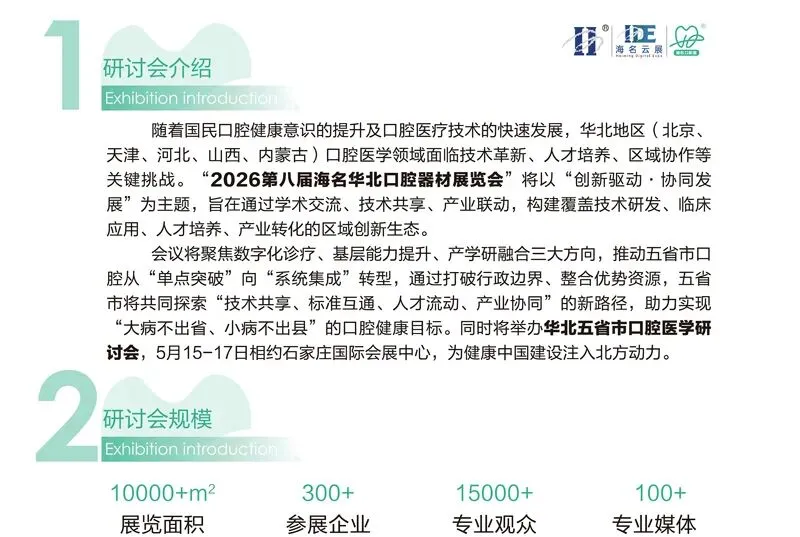 随着国民口腔健康意识的提升及口腔医疗技术的快速发展,华北地区(北京、天津、河北、山西、内蒙古)口腔医学领域面临技术革新、人才培养、区域协作等关键挑战。“2026第八届海名华北口腔器材展览会”将于2026年5月15-17日在石家庄国际会展中心(正定新馆)盛大召开,本届展会将以“创新驱动·协同发展”为主题,旨在通过学术交流、技术共享、产业联动,构建覆盖技术研发、临床应用、人才培养、产业转化的区域创新生态。