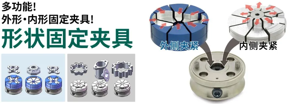 “圆柱型下拉式夹具”采用了能有效避免发生工具干涉的圆柱型设计。通过从工件的下方拉紧工件,可实现5面加工。通过圆锥面和装夹面的两面拘束进行定位,重复定位精度为5μm。可以集成加工工序。