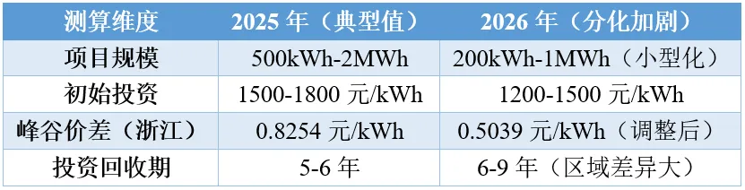 表3:工商业储能项目经济性测算对比(2025 vs 2026)