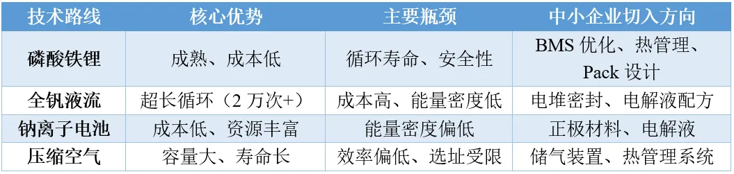如果说前四条路是“怎么活下去”,那么第五条路则是“凭什么活得更久”——技术。容量电价新政落地后,4小时及以上长时储能成为投资热点,长时专用电芯、液流电池、压缩空气储能等技术路线快速分化。头部企业在这些方向上投入重金,但中小企业并非没有机会。