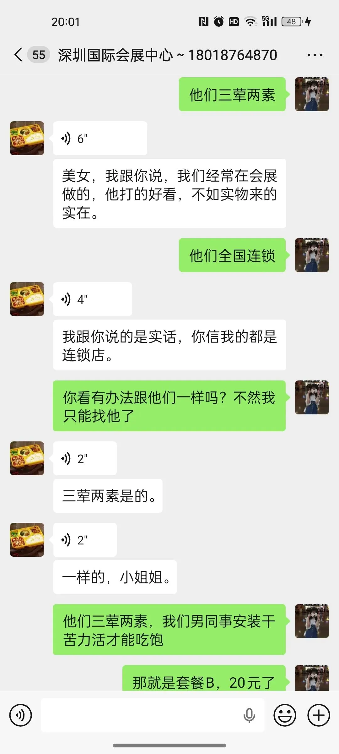 展馆推销的几家,报价都差不多,25到30一份。我就跟她砍价,20块一份,她也爽快答应了。