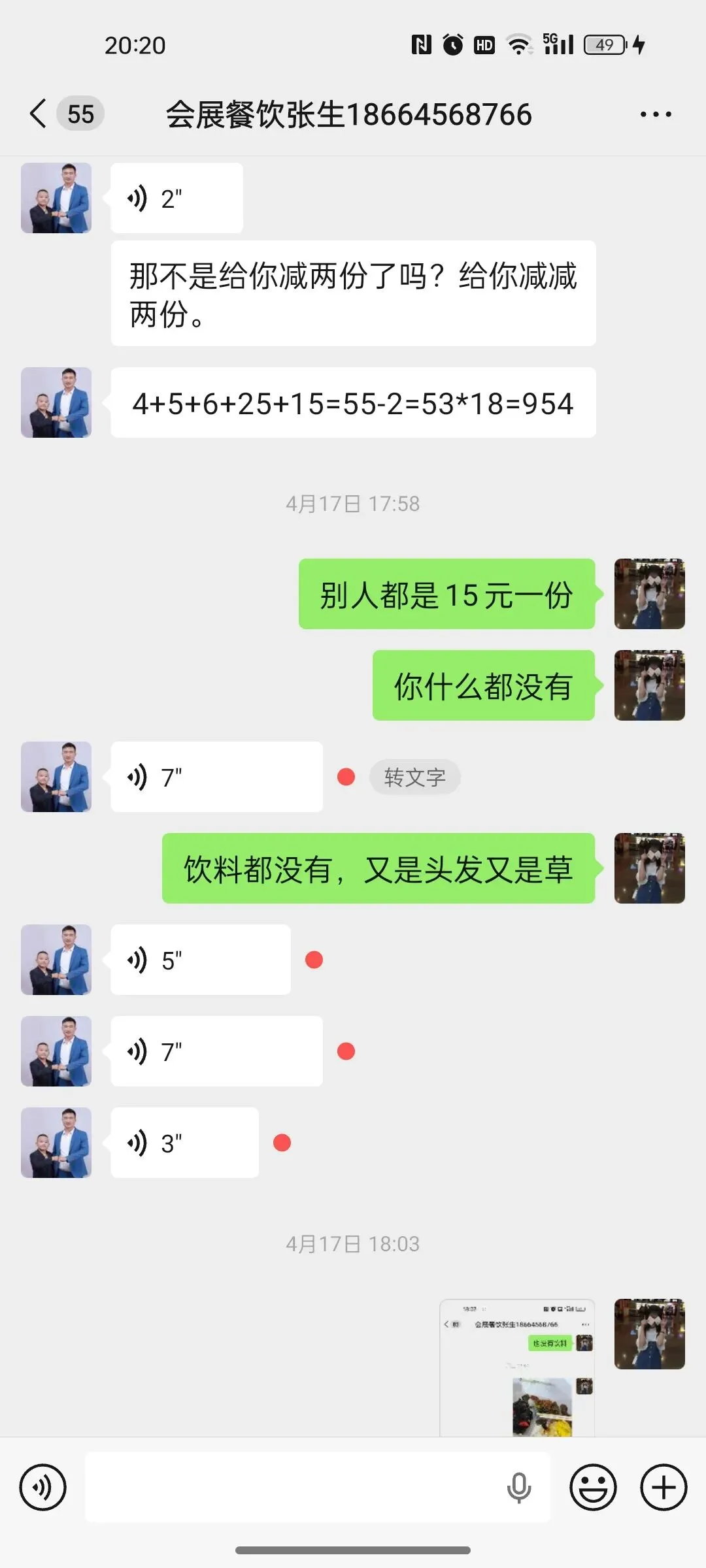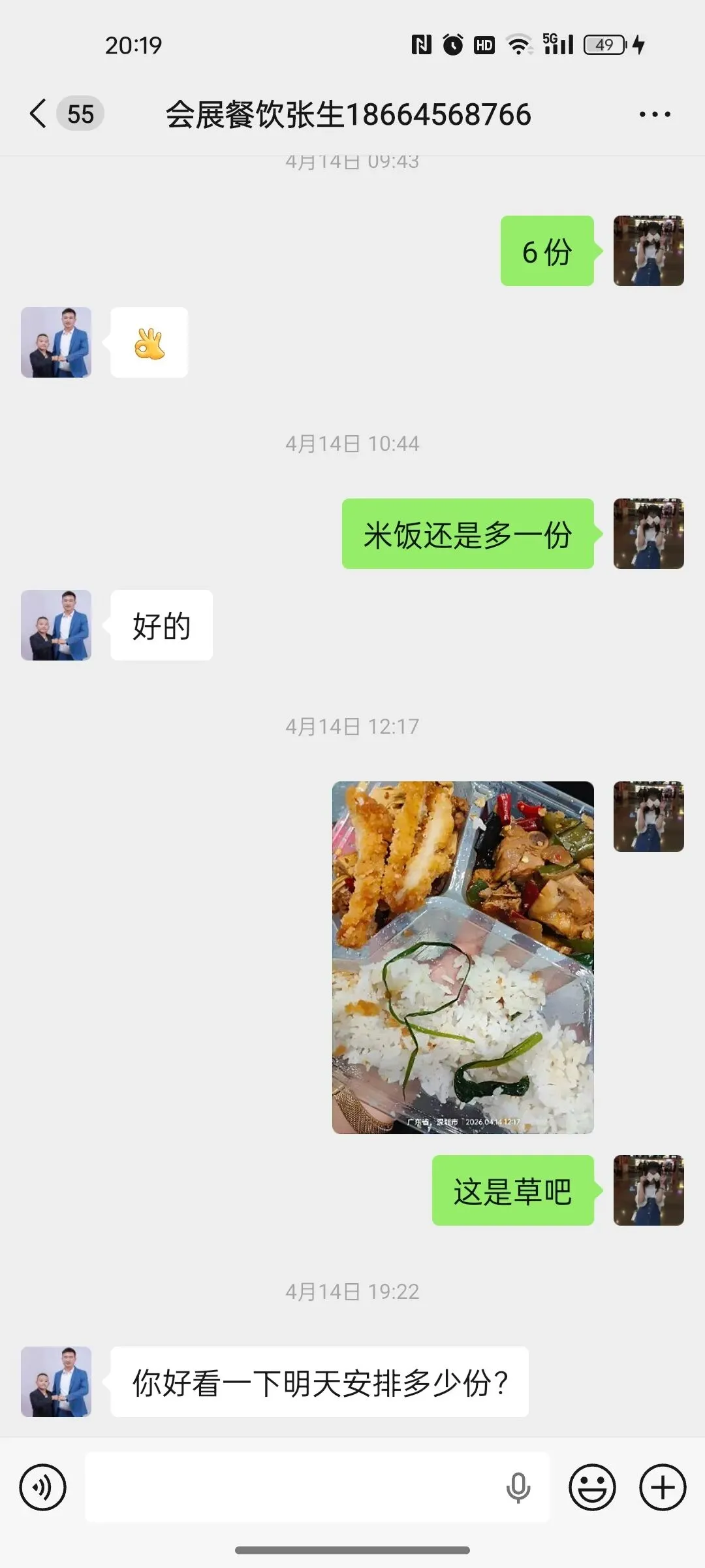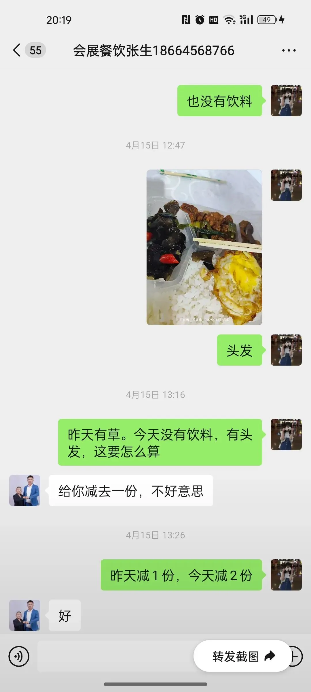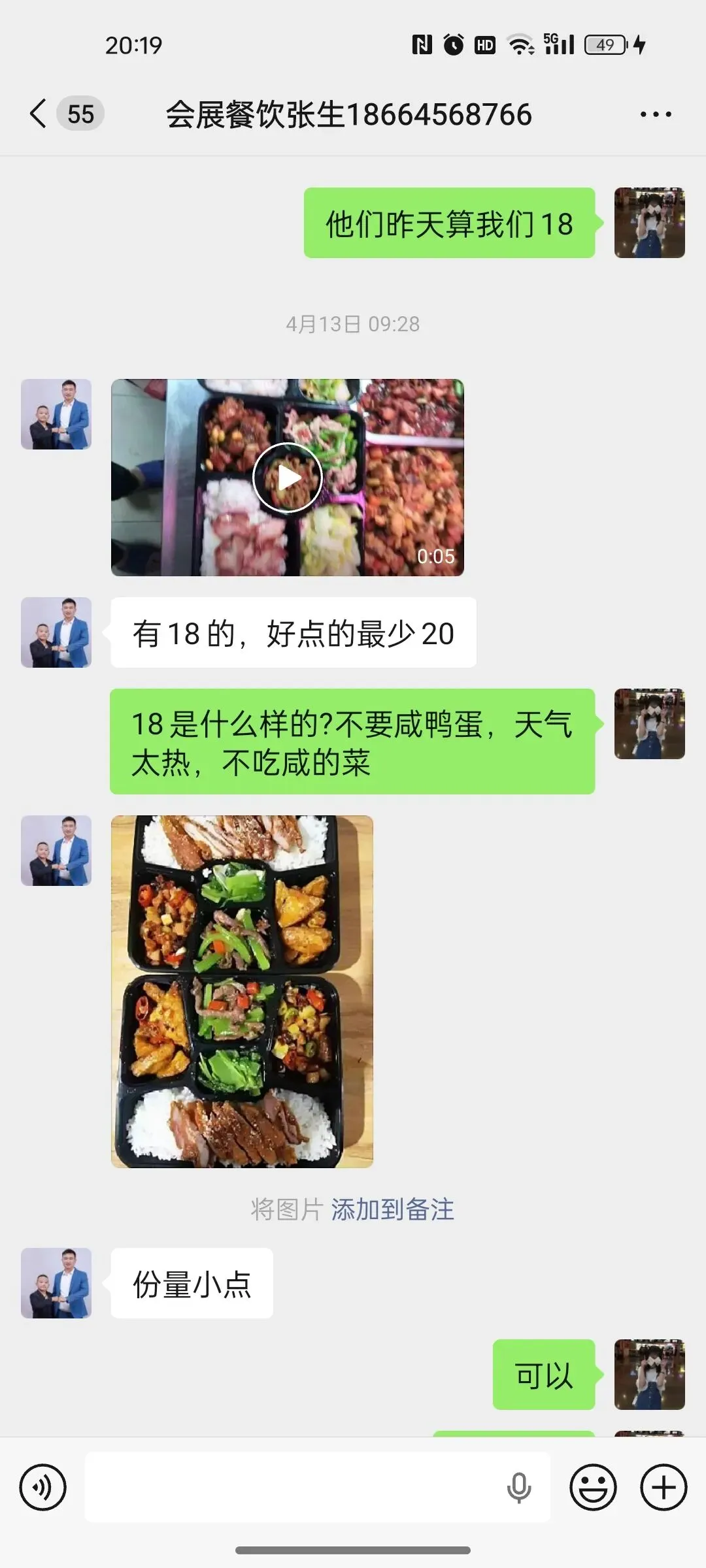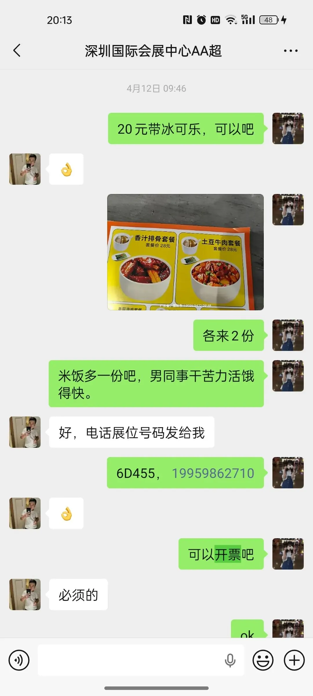 第二天我立马换了一家,谈好18块一份,但是同事觉得天气热,想喝冰可乐,我就按照20元/份,让对方加冰可乐。还特意嘱咐“千万别做咸了”。