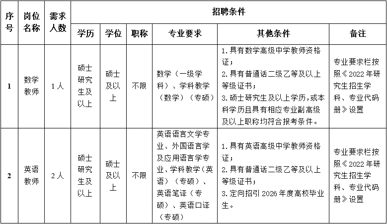 2.具有胜任应聘岗位需要的相关专业知识和工作能力,身体健康,符合应聘岗位要求的身体条件和其他所需条件。3.年龄不超过45周岁(1980年4月30日及以后出生)。5.2026届高校毕业生未取得学位证、毕业证的,需提供就业推荐表。本次人才引进采取网上报名的方式进行,报名时间2026年4月24日9:00至4月30日17:00。报名方式:登录贵州人才博览会网站(https://rc.guizhou.gov.cn/),点击页面右上角“用户登录”按钮,选择“个人用户”进行注册登录并完善简历,完善简历后进入“引才专区”,搜索“贵阳市第九中学”即可查阅岗位需求信息投递简历参与报名(此报名方式为我校唯一报名途径,其他途径报名均为无效)。其他具体要求,请以贵州人才博览会官网发布的通知为准。