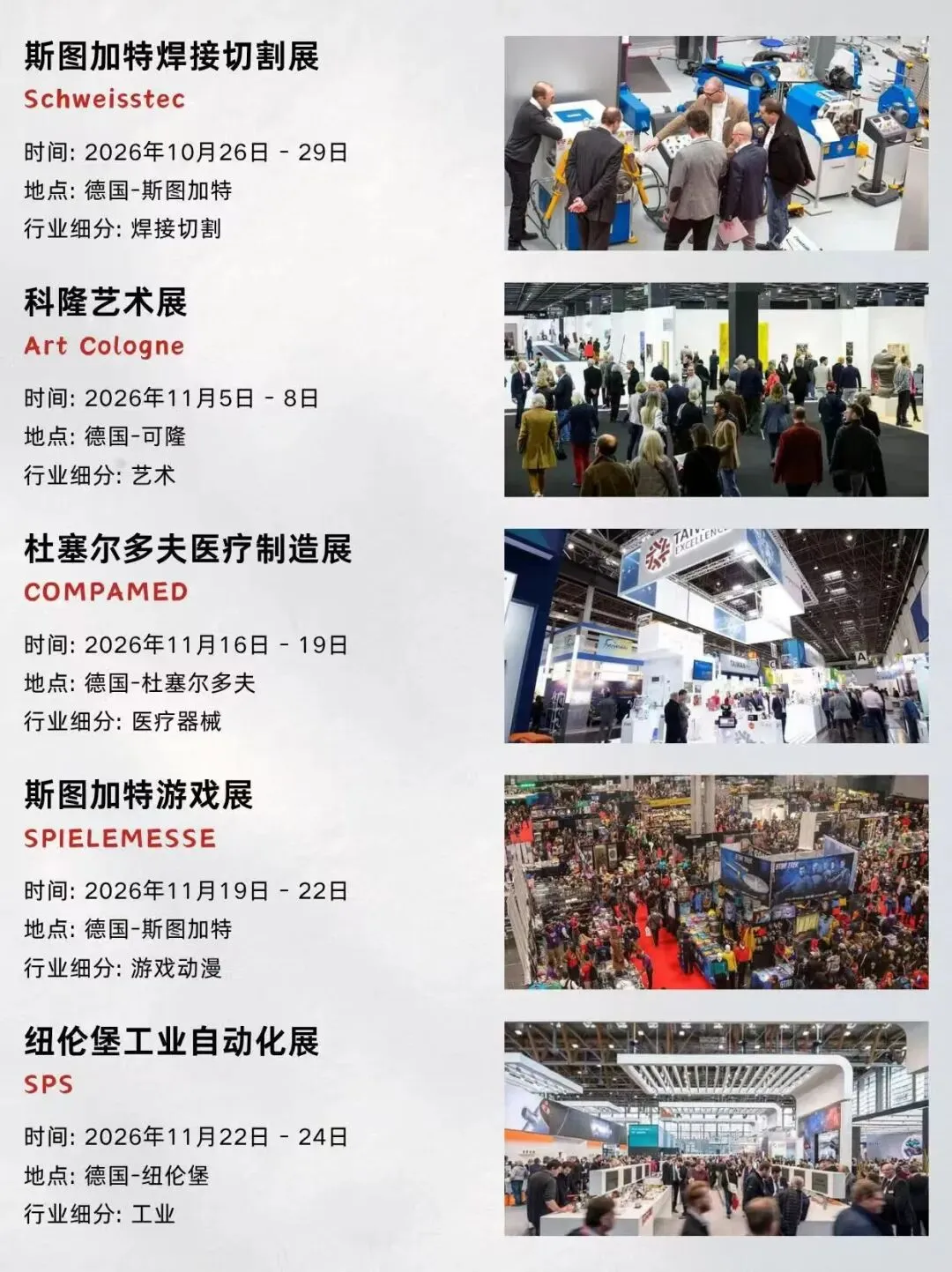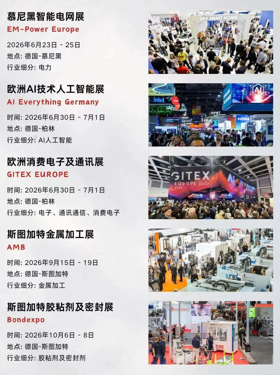 ? 德国,每年数百场行业展会,覆盖能源、制造、AI、电子、游戏等核心赛道——每一场对应一个正在爆发的欧洲产业机遇。