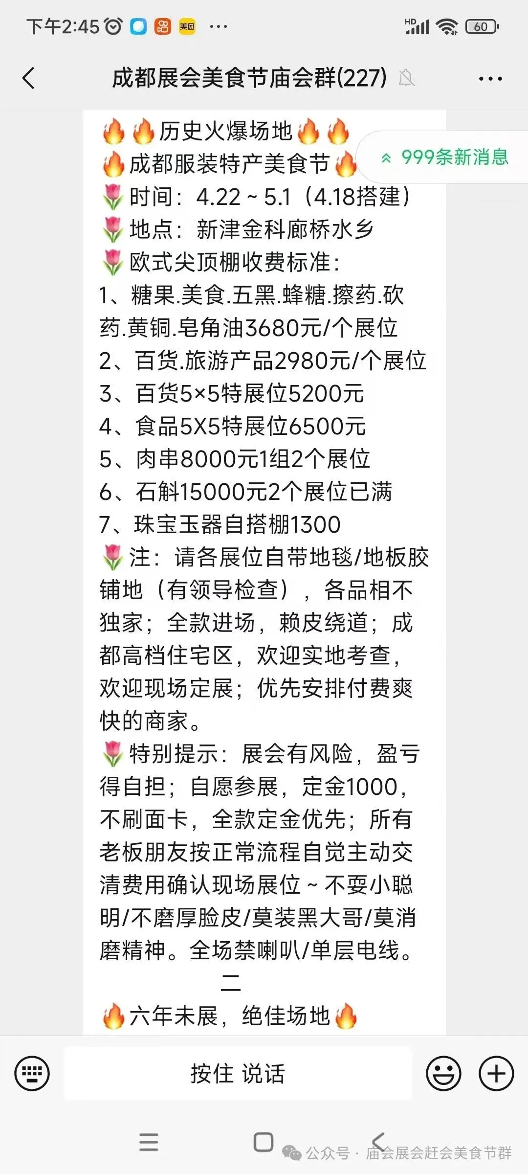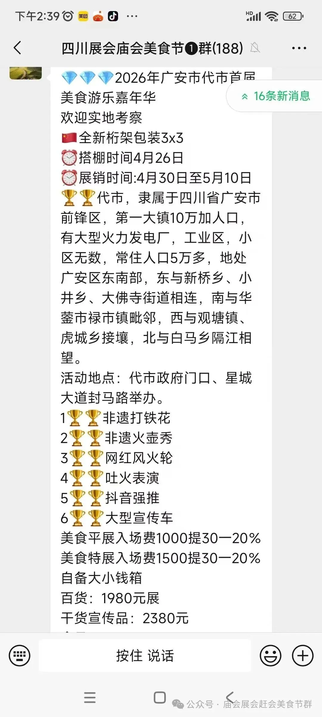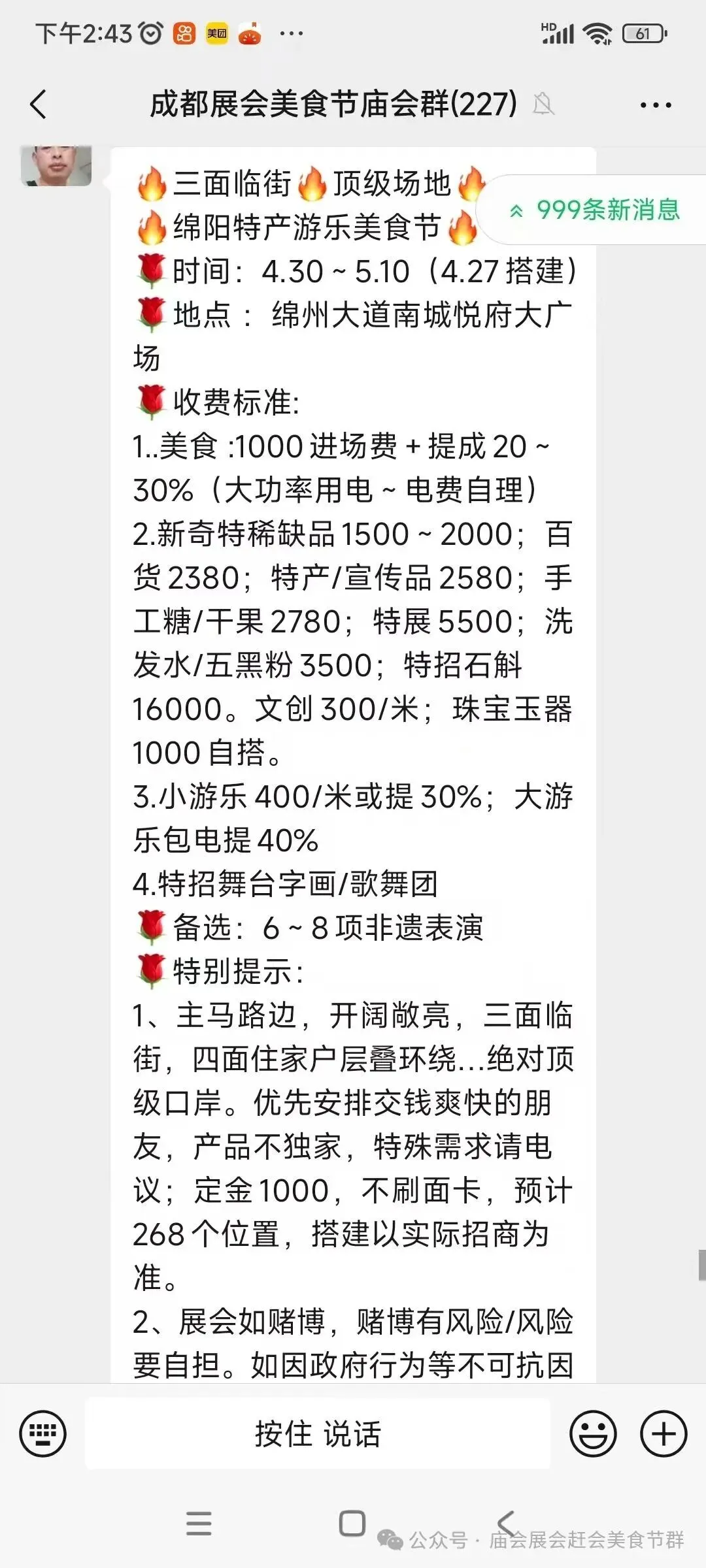 美食展位: 500场费,提成15一10,电费自理