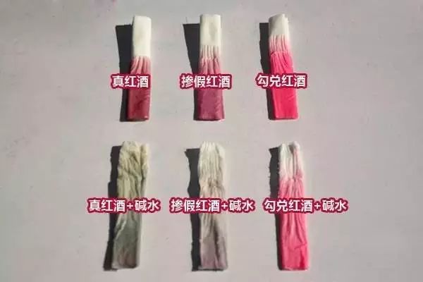 以三精一水为例,这种假酒通常添加一些人工单宁和色素,容易与水溶液不溶解,所以用“纸巾法”能鉴别出来。同时这种假酒不含有花色苷等成分,从而用“碱法”容易辨别出来。
