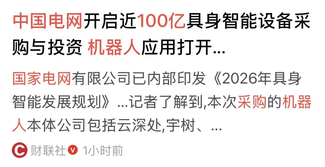当下整个高端制造与AI赛道,真正具备落地实力且实打实砸重金的方向,已经不再是概念炒作。一则含金量拉满的重磅消息直接刷屏整个行业,国家电网直接出手布局近百亿规模的具身智能设备采购与项目投资。这并不是虚无缥缈的行业规划,是实打实的招标、实打实的落地采购、实打实的规模化商用。很多人看不懂这次百亿级别采购背后真正的深意,单纯只将其当作普通的工业设备更新,实则这标志国内具身智能与人形机器人,正式跨过概念阶段,全面进入大规模商业化应用元年。