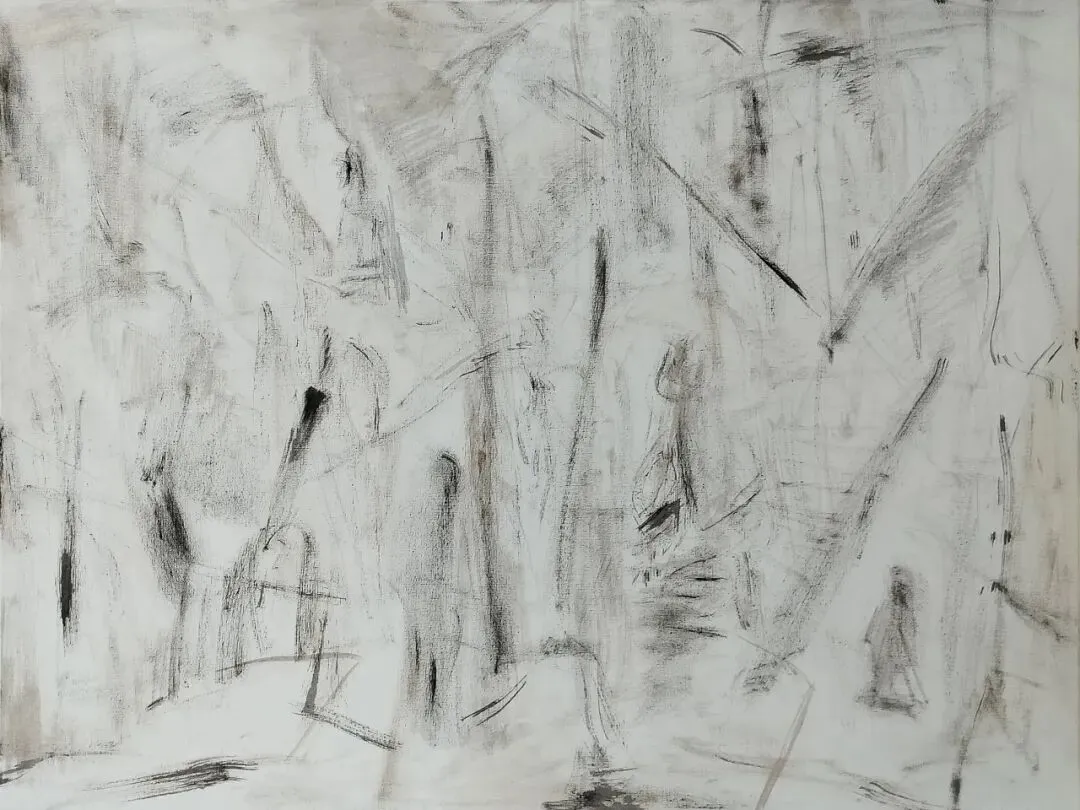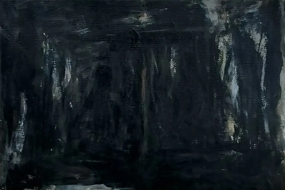 樊杰颖的绘画,是在一片幽深的墨域之中向我们徐徐展开的。那近乎令人窒息的大面积黑墨,如暗夜般笼罩,将喧嚣的表象尽数压制,仅余一线或一丝的白光,成为沉默中的代言。这种视觉冲击力超出了一般的审美范畴,迫使观者重新审视绘画的本源。