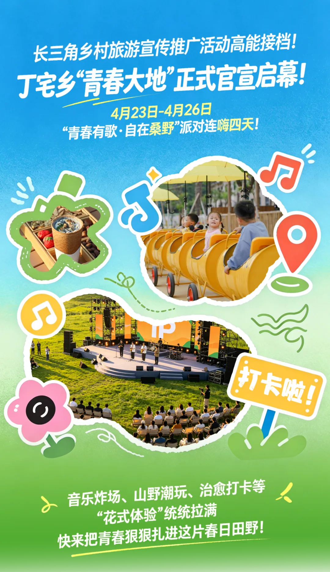4月23日至4月26日,丁宅乡将举办“青春有歌・自在桑野”青春大地启幕派对。全新亮相的青春大地,设置稻田小火车、青禾漫咖、青禾营地、青春艺术中心四大必打卡点位,带您纵览所有春日美好。
