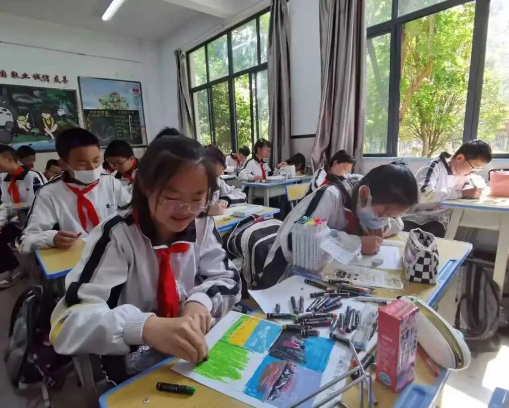 《减压赋能,“赢”接中考》团体辅导活动中,老师们设计了“压力气球”环节——孩子们将那些说不出口的焦虑写在纸条上,塞进气球,用力吹大,然后狠狠踩爆。一声声脆响中,压抑已久的情绪终于找到出口。有学生笑着说:“好像心里的那块石头也跟着碎了。”随后的“梦想纸飞机”环节,孩子们将对未来的期许折成纸飞机,奋力掷向远方。蓝天下,纸飞机划出优美的弧线,仿佛梦想也在此刻张开了翅膀。《心理绘画蕴初心》活动中,初三学子用画笔描绘心中的那座“山”。有人画下陡峭的悬崖,却在崖顶添了一轮旭日;有人画下蜿蜒的山路,却在路边画满了野花。每一幅画都是一次与自我的对话,每一笔色彩都是对压力的温柔化解。