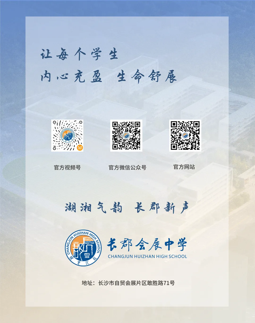 长郡会展中学秉承“朴实沉毅”的长郡校训,践行“让每个学生内心丰盈、生命舒展”的办学理念,致力于“办一所充满活力的高品质学校”,培养“爱生活、乐求知、忧天下、有担当”的时代新人。