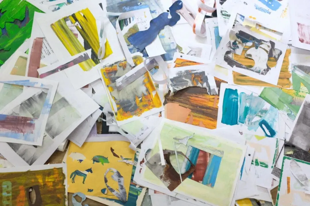 这些纸是艺术家做版画时剩下的油墨随机滚在复印纸上产生的,它们是艺术家拼贴画的创作材料。