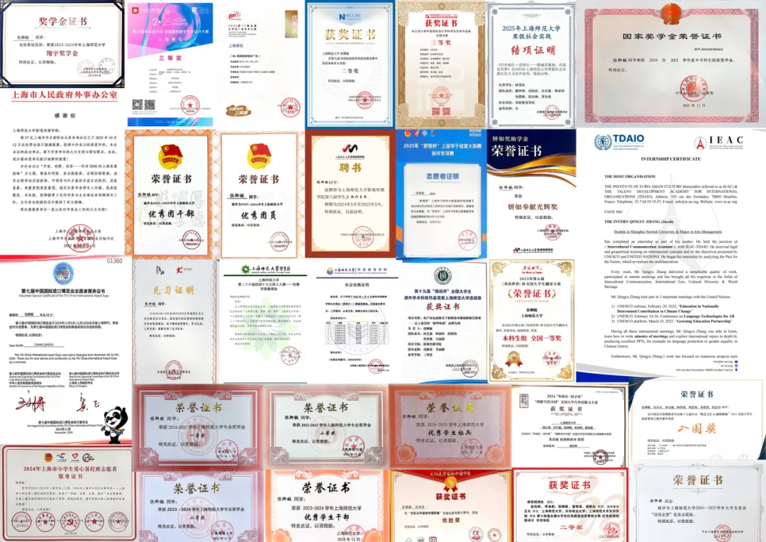 在刻苦钻研中夯实根基,在竞赛历练中检验自我。入校以来,他始终保持严谨认真的学习态度,专业基础扎实,连续三年综测排名第一,以优异成绩成功推免至上海大学,并先后获得国家奖学金、校专业奖学金一等奖、翔宇奖学金等荣誉。他深知,课堂之内的积累是起点,而非终点,“外研社·国才杯”全国大学生外语能力大赛国赛银奖、米兰设计周·中国高校设计学科师生优秀作品展国赛三等奖、未来设计师·全国高校数字艺术设计大赛上海赛区三等奖等多项国家级、省市级奖项便是他在不同赛道上不断拓展自己专业边界的证明。