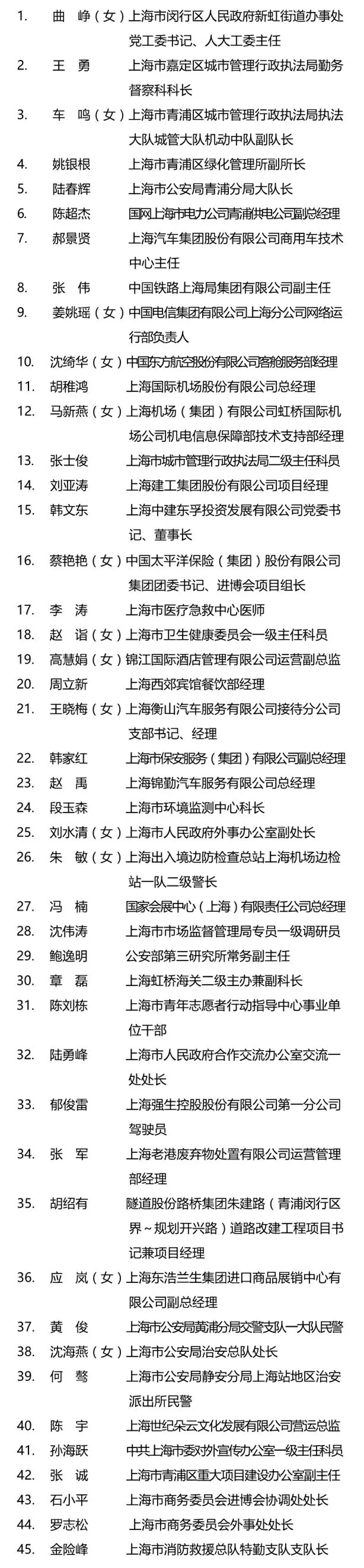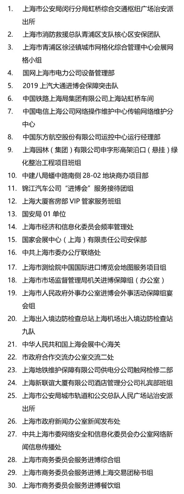 市总工会说,将对在第二届进博会期间涌现出的先进集体和个人给予表彰:闵行区经济委员会、徐泾镇人民政府、新闻报社等30个单位成为上海市五一劳动奖状候选;曲峥、王勇、车鸣等45名个人成为上海市五一劳动奖章候选;市公安局闵行分局虹桥综合交通枢纽广场治安派出所、国网上海市电力公司设备管理部、市政府新闻办公室新闻发布处等30个集体成为上海市工人先锋号候选。详见↓