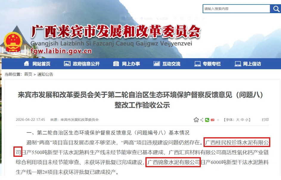 4月22日,来宾市发改委正式对外公示第二轮自治区生态环保督察整改验收结果,广西桂民投珍珠水泥、广西锦象水泥两家企业之前被点名的“两高”项目违规建设问题,现在已经全部整改完毕。