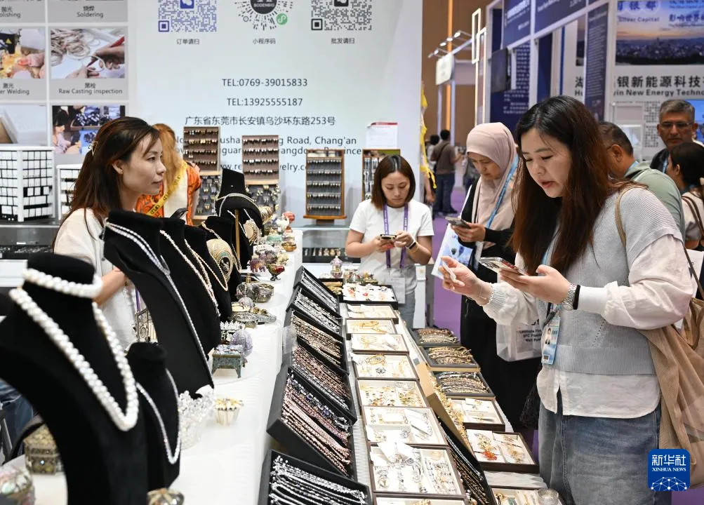 4月23日,采购商(右)在第139届广交会第二期的时尚饰品专区洽谈。