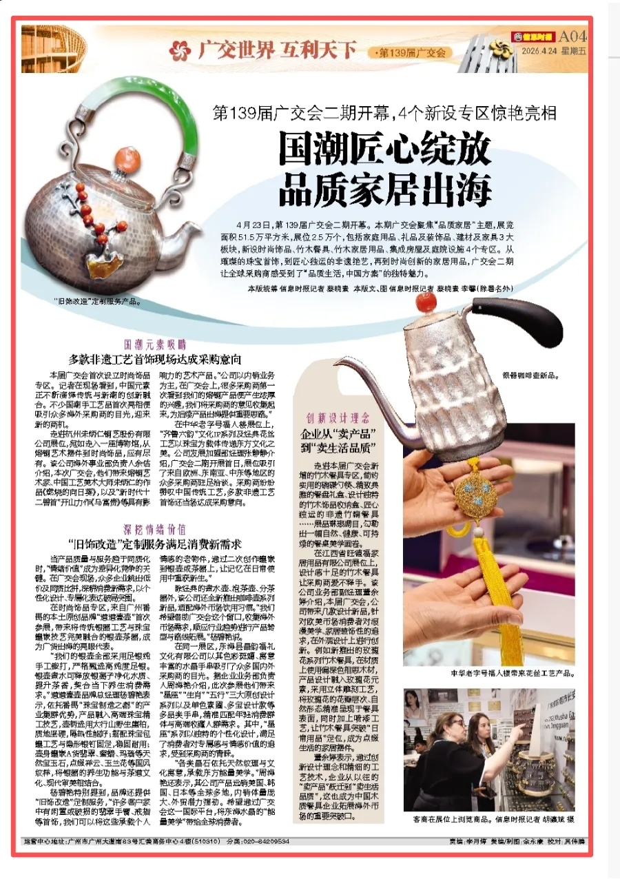 4月24日,信息时报刊发《第139届广交会二期开幕,4个新设专区惊艳亮相,国潮匠心绽放,品质家居出海》,内容如下: