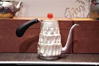 “我们的银壶全部采用足银纯手工锻打,严格甄选高纯度足银。银壶煮水可释放银离子净化水质、提升茶香,契合当下养生消费需求。”道道壹壶品牌总经理杨碧艳表示,依托番禺“珠宝制造之都”的产业集群优势,产品融入高端珠宝精工技艺,壶柄选用太行山野生崖柏,质地坚硬,隔热性能好;搭配珠宝包镶工艺与隐形银钉固定,稳固耐用;壶身镶嵌A货翡翠、蜜蜡、玛瑙等天然宝玉石,点缀祥云、玉兰花等国风纹样,将银器的养生功能与茶道文化、现代审美相结合。