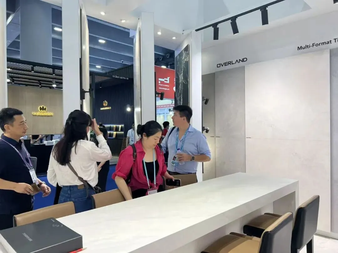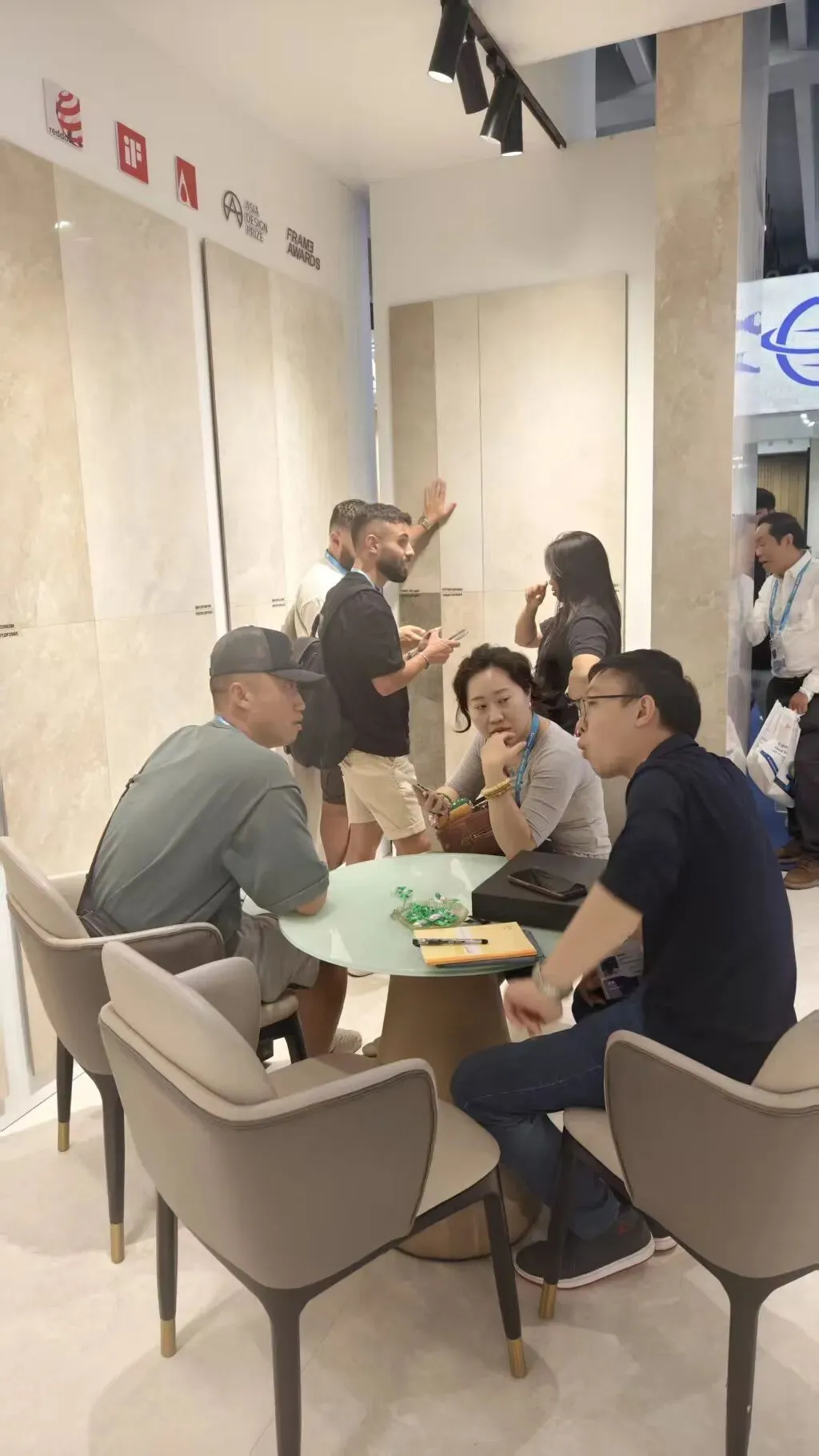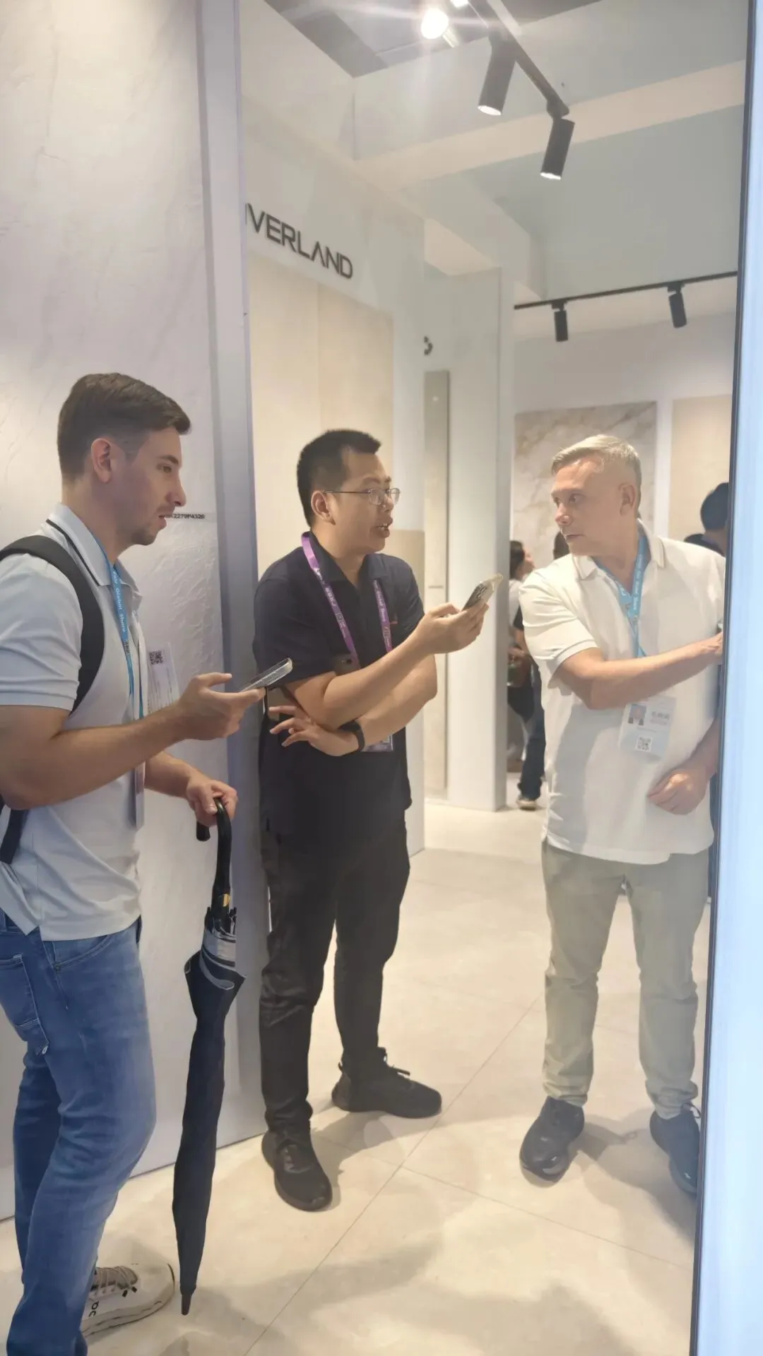 展会首日,欧文莱吸引北美、欧洲、东南亚等多国采购商驻足,素色瓷砖、精品岩板新品获询盘量激增。北美客户盛赞“色彩与工艺细节媲美国际顶级品牌”,欧洲客商则聚焦技术转化的自然呈现。