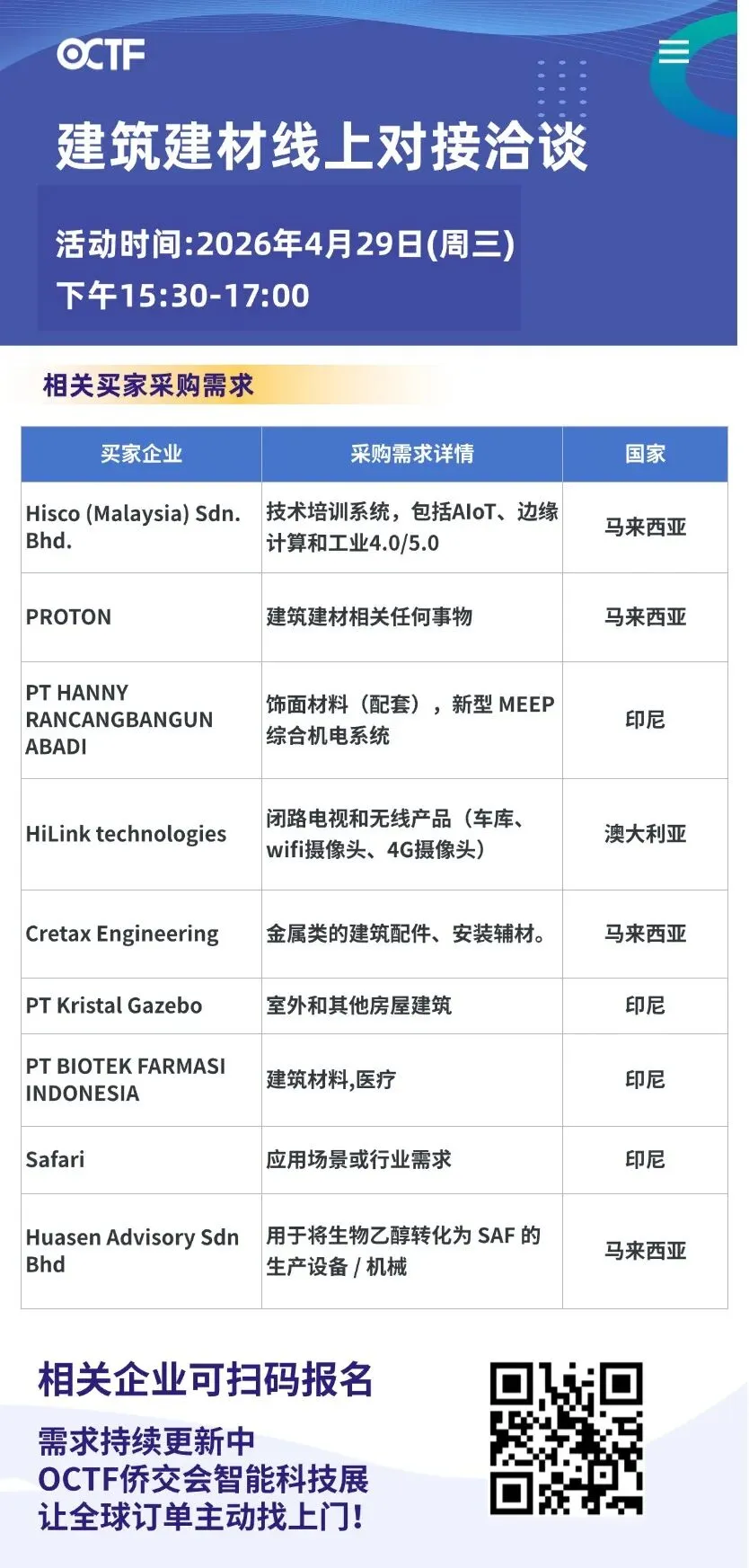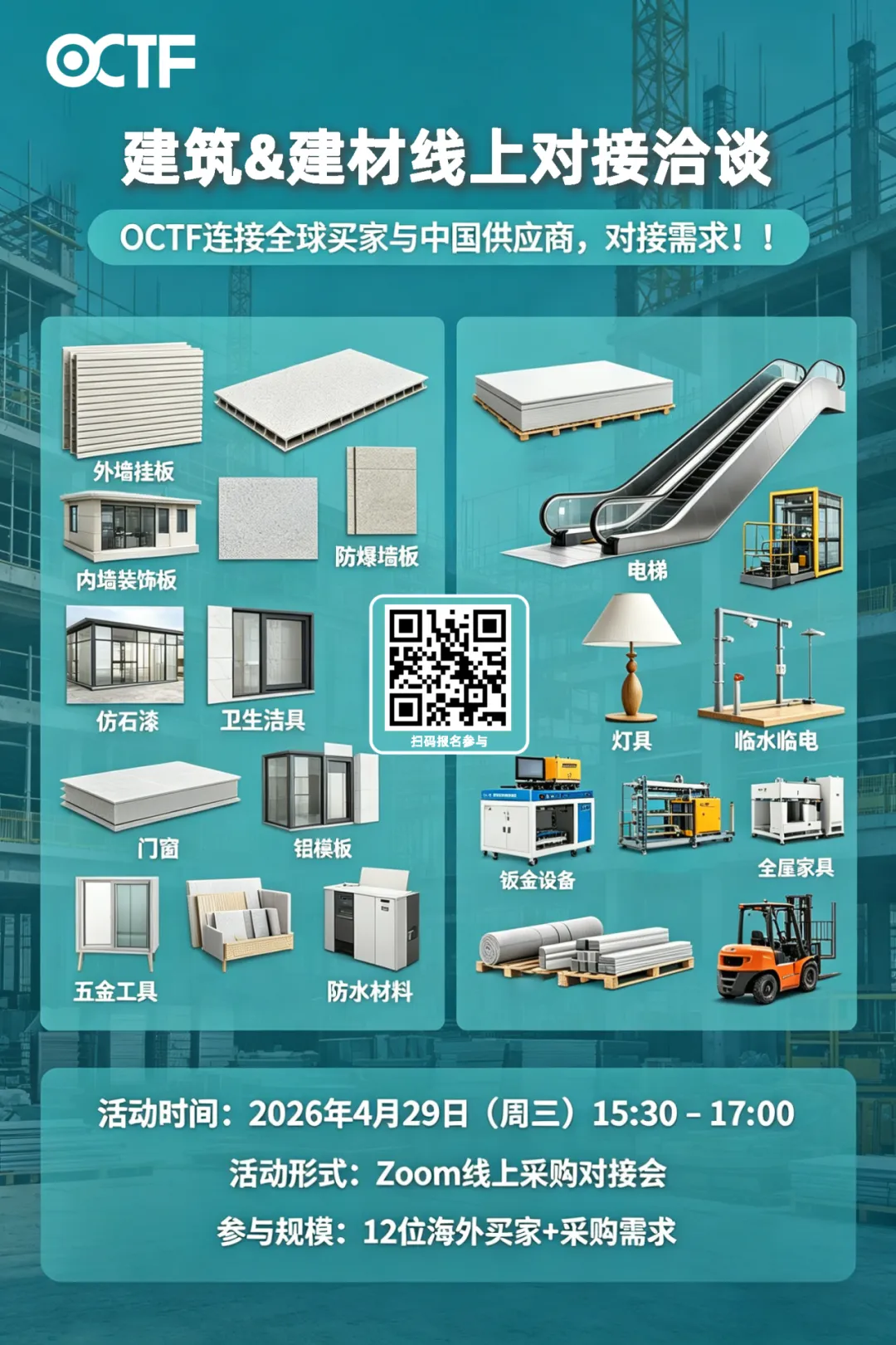 海外买家对中国建筑建材产品的关注度不断提升。为了帮助中国优质供应商更高效对接国际采购资源,我们将于 2026年4月29日 举办 建筑建材线上采购对接会,通过线上方式组织海外买家与中国供应商开展精准交流,推动务实合作。
