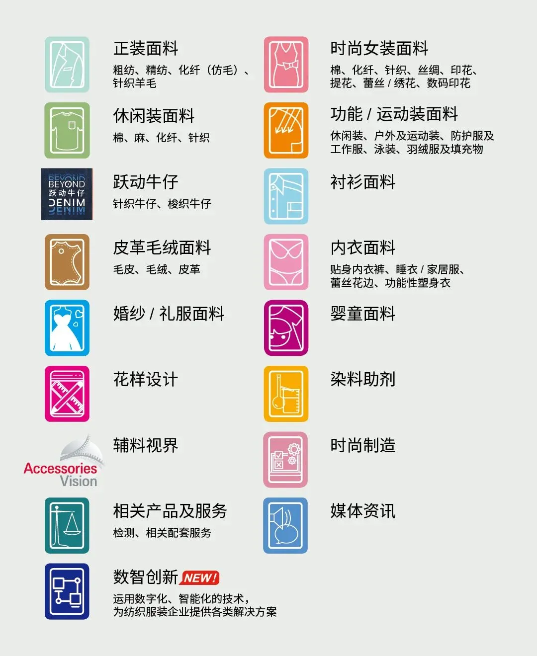 2026Intertextile大湾区面辅料展,将科学划分正装面料、时尚女装面料、休闲装面料、功能/运动装面料、跃动牛仔、衬衫面料、皮革毛绒面料、内衣面料、婚纱/礼服面料、婴童面料、花样设计、染料助剂、辅料视界、时尚制造、数智创新、媒体资讯、相关产品及服务17大专业展区,生动描绘功能升级、数智升级、营销升级的产业场景化创新图景。无论你是面辅料优势企业,还是实力制造企业,亦或者领先市场的服务商,欢迎您踊跃报名,在相应展区内一展风采,为前来的专业买家以及同台参展的展商提供趋势灵感与升级服务之选。
