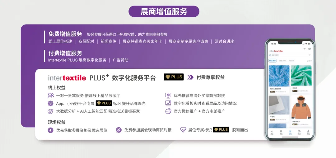 2026Intertextile大湾区面辅料展将继续发力线上,持续放大展会长尾效应。一方面,为每一位报名参展的展商,提供线上展位搭建、商贸配对、新闻宣传、展商特邀贵宾买家年卡、展商定制专属客户请柬、研讨会讲座等免费线上增值服务;一方面,针对升级需求展商,推出Intertextile PLUS+付费增值服务,以更高线上权益与线下权益,让Intertextile PLUS+展商获得更高关注,实现更好商贸转化。