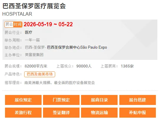 [展位预定、门票预定、展商目录、展台搭建、差旅行程、签证、翻译、物流运输、补贴申报]