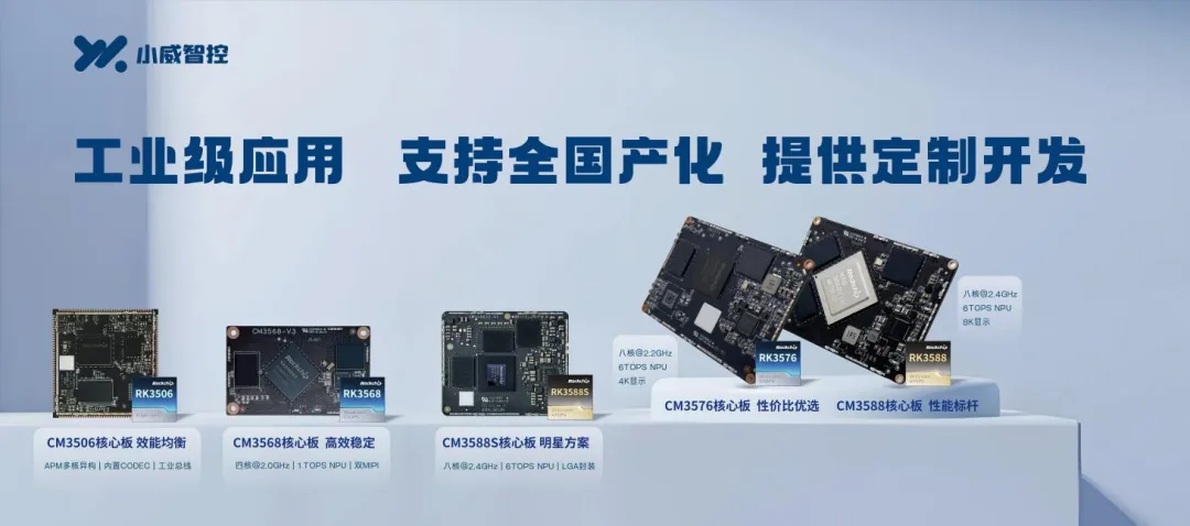 小威智控核心板基于瑞芯微RK3588、RK3588S、RK3576、RK3568、RK3506等国产处理器设计,支持100%国产化元器件,符合工业级应用标准,具备强大的计算能力与丰富的接口扩展性,广泛应用于工业自动化、机器人、智慧医疗、电力能源等场景。