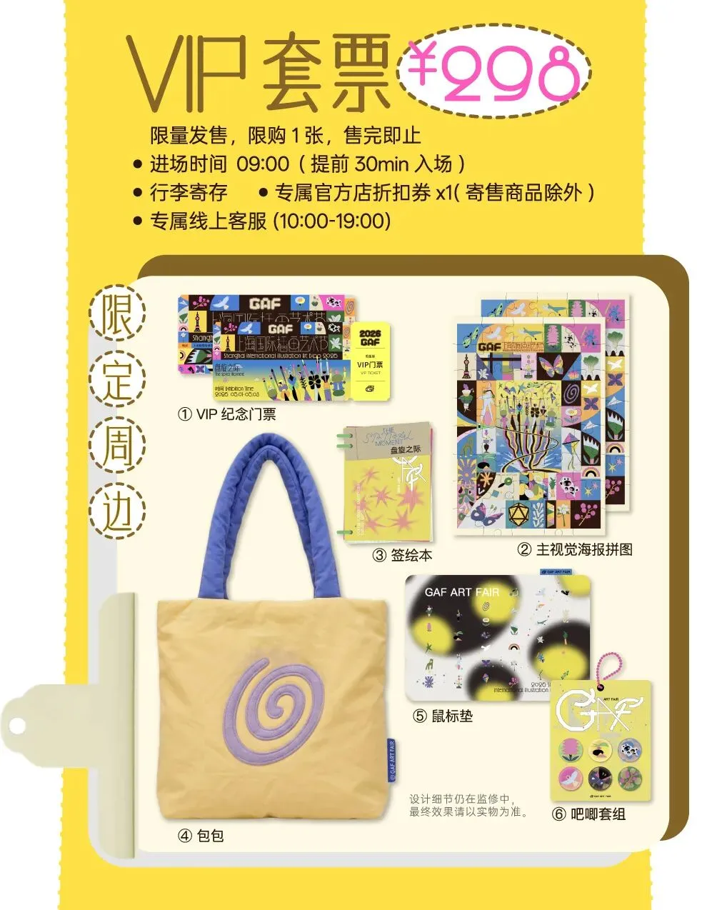 包含VIP纪念票根、主视觉拼图、签绘本、多巴胺鼠标垫、吧唧套组及撞色包包共6件定制好物 。