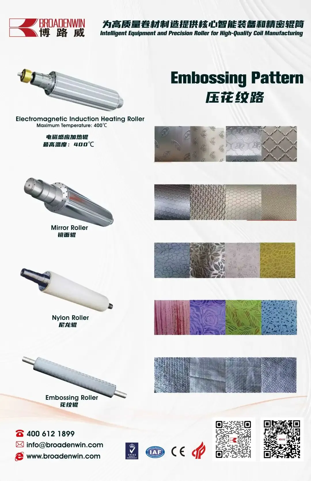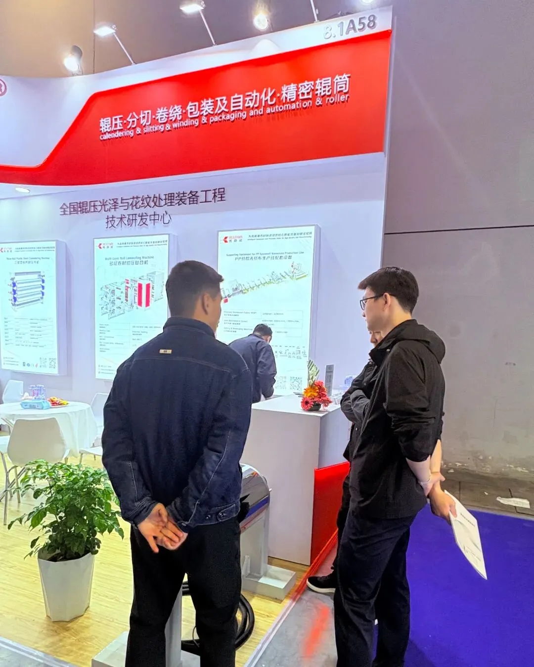 本次重点展示的实物展品包括电磁感应加热辊和花纹辊,同时通过灯箱海报展示了镜面辊、尼龙辊等全系列精密辊筒矩阵,以及膜材分切机、三辊压光机、多层卷材辊压复合机、无纺布整线配套设备等成套智能装备。
