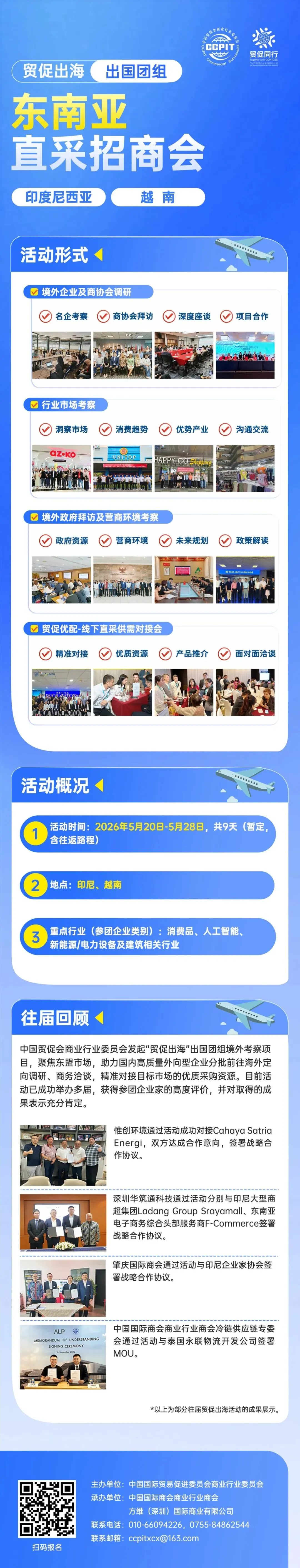 商业贸促会拟于2026年5月下旬组织“贸促出海-东南亚直采招商会”团组出海。活动期间拟拜访印尼工业部、印尼企业家协会(TES)、印尼青年企业家协会(HIPMI)、印尼头部企业Erajaya集团,以及越南科技部、越南建设部、胡志明市贸易与投资促进中心(ITPC)、新华集团(越南)、FPT集团等多国政府部门、商协会及重点企业,通过实地对接与深度交流,助力企业精准把握当地政策红利及市场实操信息,切实帮助中国企业抓商机,拓市场,找订单。活动形式如下: