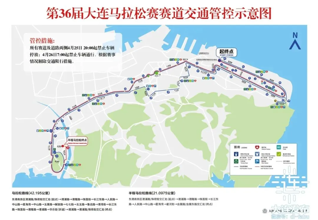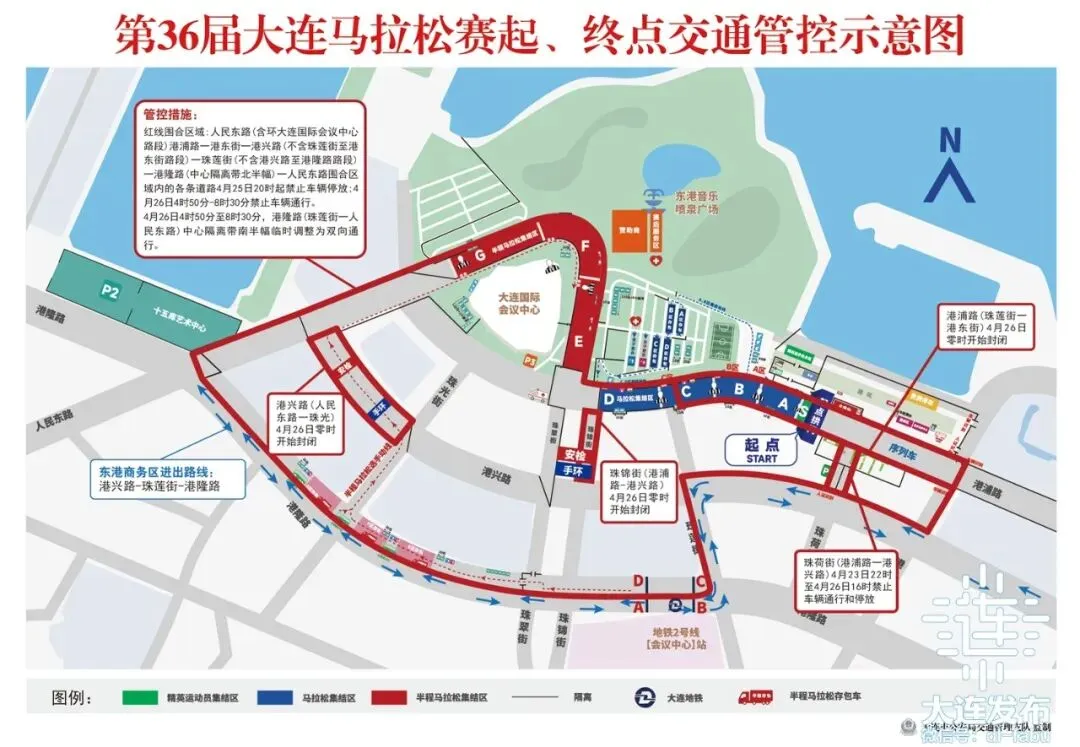第36届大连马拉松赛将于2026年4月26日在我市举行。全程比赛起点、终点都在东港商务区;半程比赛起点在东港商务区,终点在会展路。
