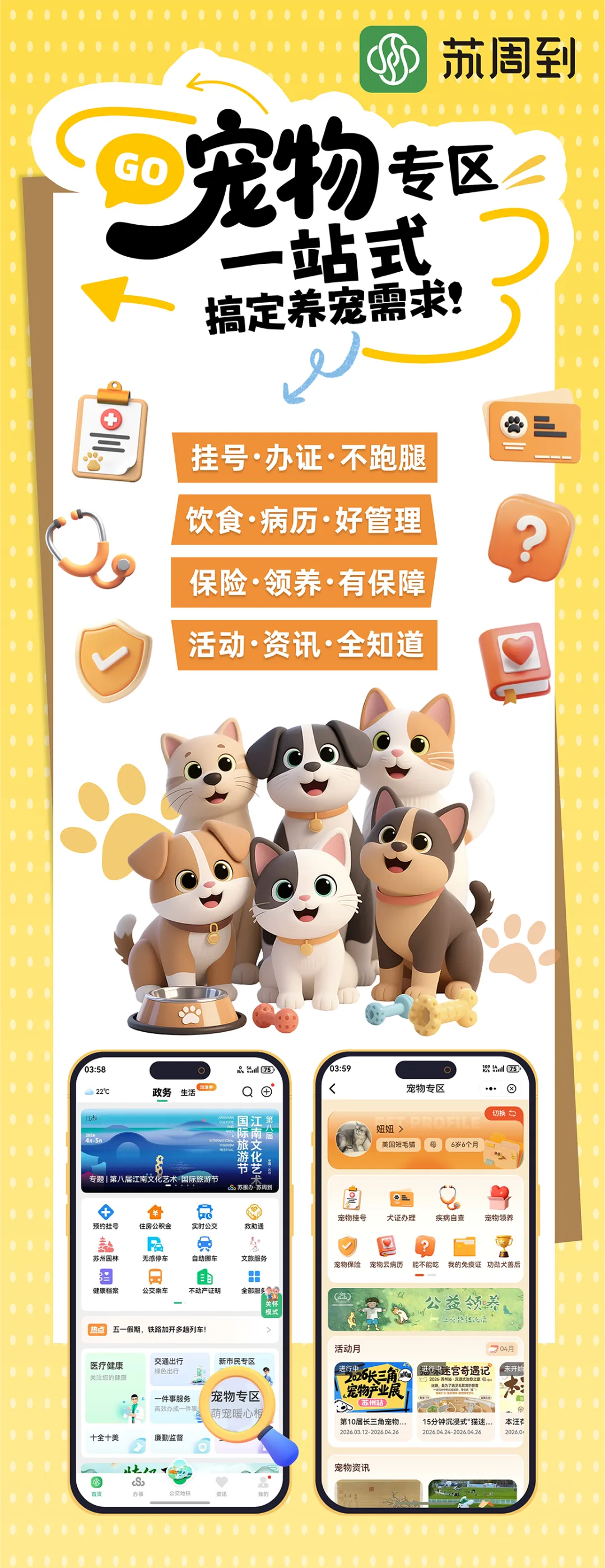 苏周到宠物专区是由苏州市数据局、市农业农村局等多部门指导,联合市宠物产业协会与市小动物保护志愿者协会打造的苏州专属线上宠物服务根据地,助力苏州打造“宠物友好城市”。