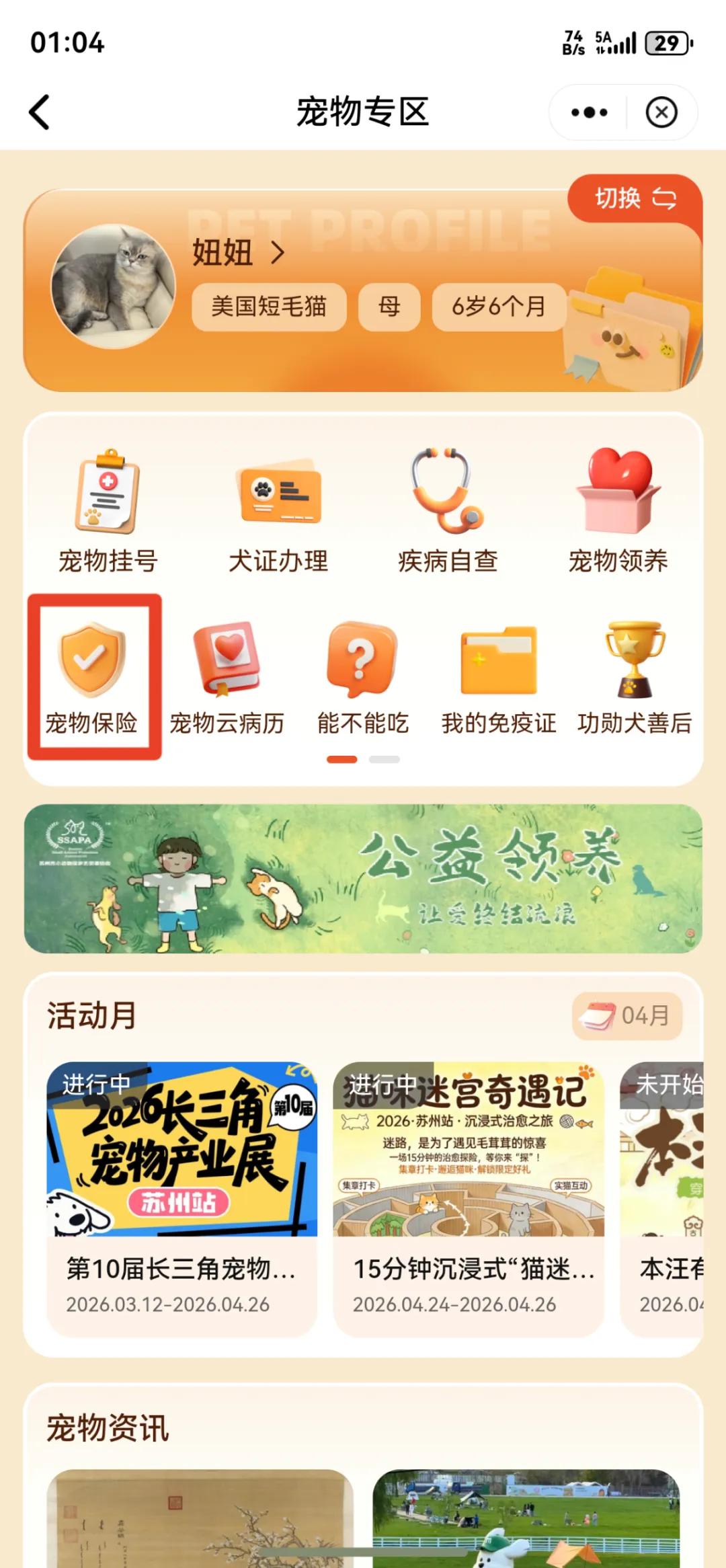作为便捷实用的线上养宠服务阵地,苏周到宠物专区打造全场景一站式养宠体验,集结犬证办理、宠物挂号、疾病自查、宠物领养、云病历管理、饮食查询等高频刚需服务,彻底告别养宠跑腿繁琐,指尖操作就能轻松搞定各类养宠事宜,让养宠更省心、更便捷。