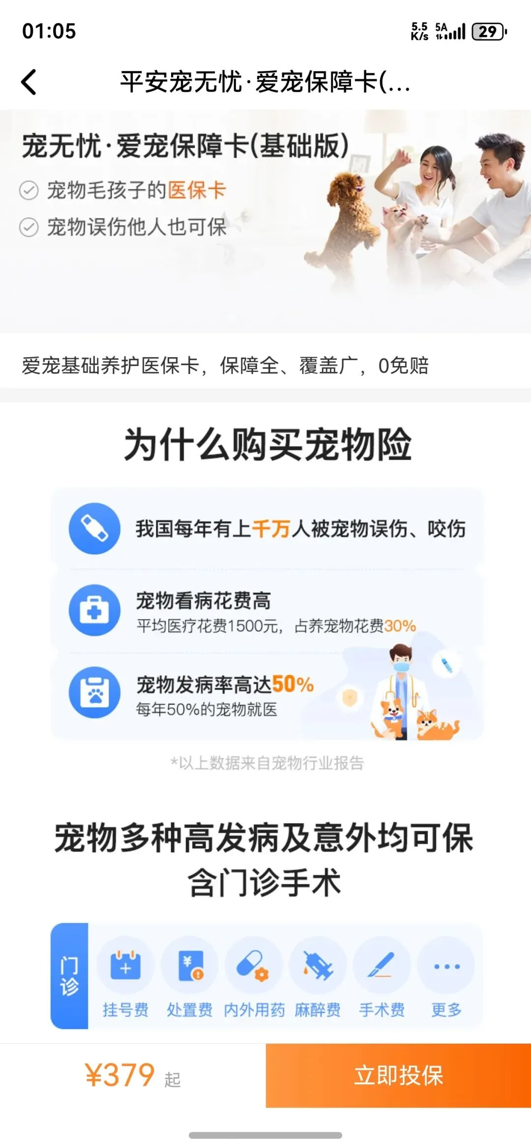 专为爱宠定制的平安宠无忧·爱宠保障卡,用亲民预算筑牢安心保障:379元起/年,日均低至1元,意外保障0等待,疾病保障30天快速生效;涵盖宠物医疗+第三者双重责任,看病就医、宠物误伤他人均可保障,看病闯祸双兜底;更有体检、洗护、疫苗三大增值服务三选一免费享,给毛孩子全天候的贴心守护。