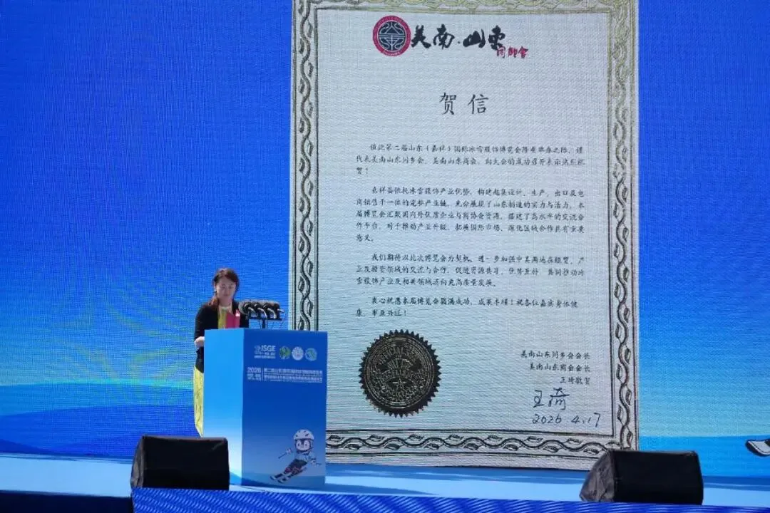 济宁市委常委、宣传部部长、济宁市纺织服装产业链链长董冰致辞。她说,近年来,济宁市坚定不移贯彻新发展理念,聚力实施工业经济头号工程,特别是将纺织服装产业链作为全市15条标志性产业链之一,通过技术革新、延链补链、品牌赋能,形成了从纤维、纺纱、织布到服装、家纺的完整产业生态,打造了鱼台莱赛尔纤维、嘉祥冰雪服饰、汶上服装、高新区纺织等特色产业集群。嘉祥作为济宁产业版图中的重要一极,依托“中国手套名城”金字招牌,聚力打造冰雪服饰全产业链,实现了从单一手套到全品类冰雪服饰、从传统加工到智能智造、从国内市场到全球布局的跨越式发展。
