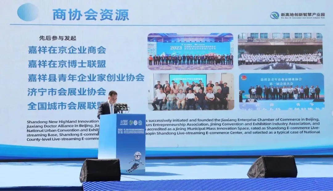 济宁市会展业协会会长、嘉祥县青年创业协会会长、山东新高地创新智慧产业园有限公司总经理陈凤良介绍了山东新高地创新智慧产业园发展情况——2023年5月举办了第一届展销会,累计达成销售贸易额约1530万元。2024年4月第二届展销会,累计达成销售贸易额约1988.9万元。2025年4月第三届展销会,累计达成销售贸易额约2300万元。2026年4月,意向贸易额约3200万元。重点介绍了产业布局和打造展会品牌的有效举措。