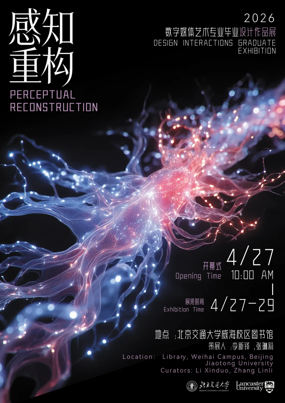 This exhibition showcases the works of the graduating seniors from Design Interactions, Lancaster University College at Beijing Jiaotong University. It presents a wide range of creative outcomes in interaction design, digital media, immersive experiences, and digital narrative, reflecting diverse explorations shaped by a cross-cultural design education context.