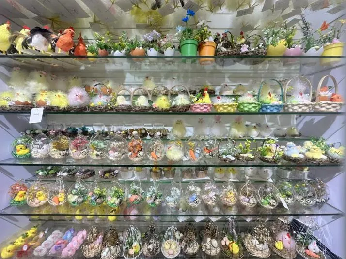 礼品赠品展位(品牌)重点展示复活节节日装饰品,涵盖手工玻璃饰品、复活节绒鸡、彩蛋、布艺兔子和小羊、羽毛蝴蝶及木制挂件等。精选展品超2000件,新品占比70%,全流程践行绿色环保理念,具备高质环保与高性价比优势,获得海外采购商广泛关注。