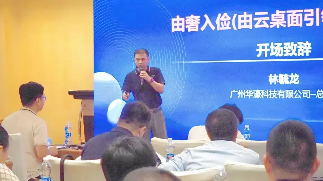 在会议开始,广州华濠总经理林毓龙作“由奢入俭(由云桌面引领的IT变革)”开场致辞。林总首先带领与会者回忆了上次会议的亮点,随后转向对当前国际形势和行业动态的分析。他指出,随着云计算、人工智能等技术的成熟,IT行业正在经历从高利润驱动的高投入阶段向更加注重成本控制和服务质量的转变。在当前的市场环境下,“由奢入俭”成为了IT行业的关键词。由于国外知名厂商的退出,在外部压力和内部需求的双重推动下,国内厂商开始加速推进国产化和自主创新,以减少对外部技术的依赖,这为遥岚云桌面等新兴云桌面品牌提供了广阔的市场空间。