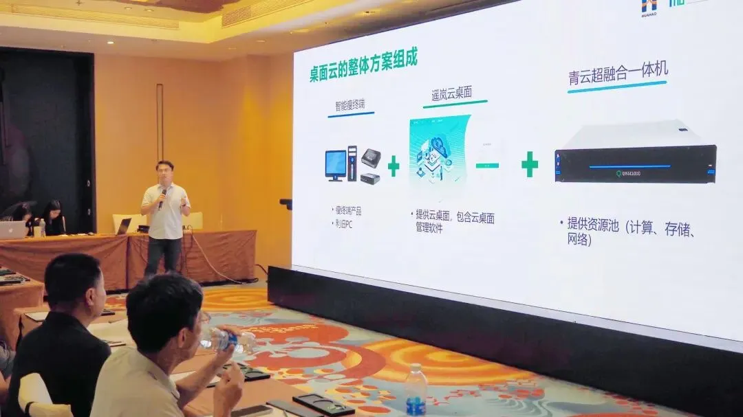 会议最后,北京青云解决方案架构师黎锦添作“双擎驱动企业IT架构高质量替换”主题分享,讲述青云助力构建遥岚云桌面数字化底座。