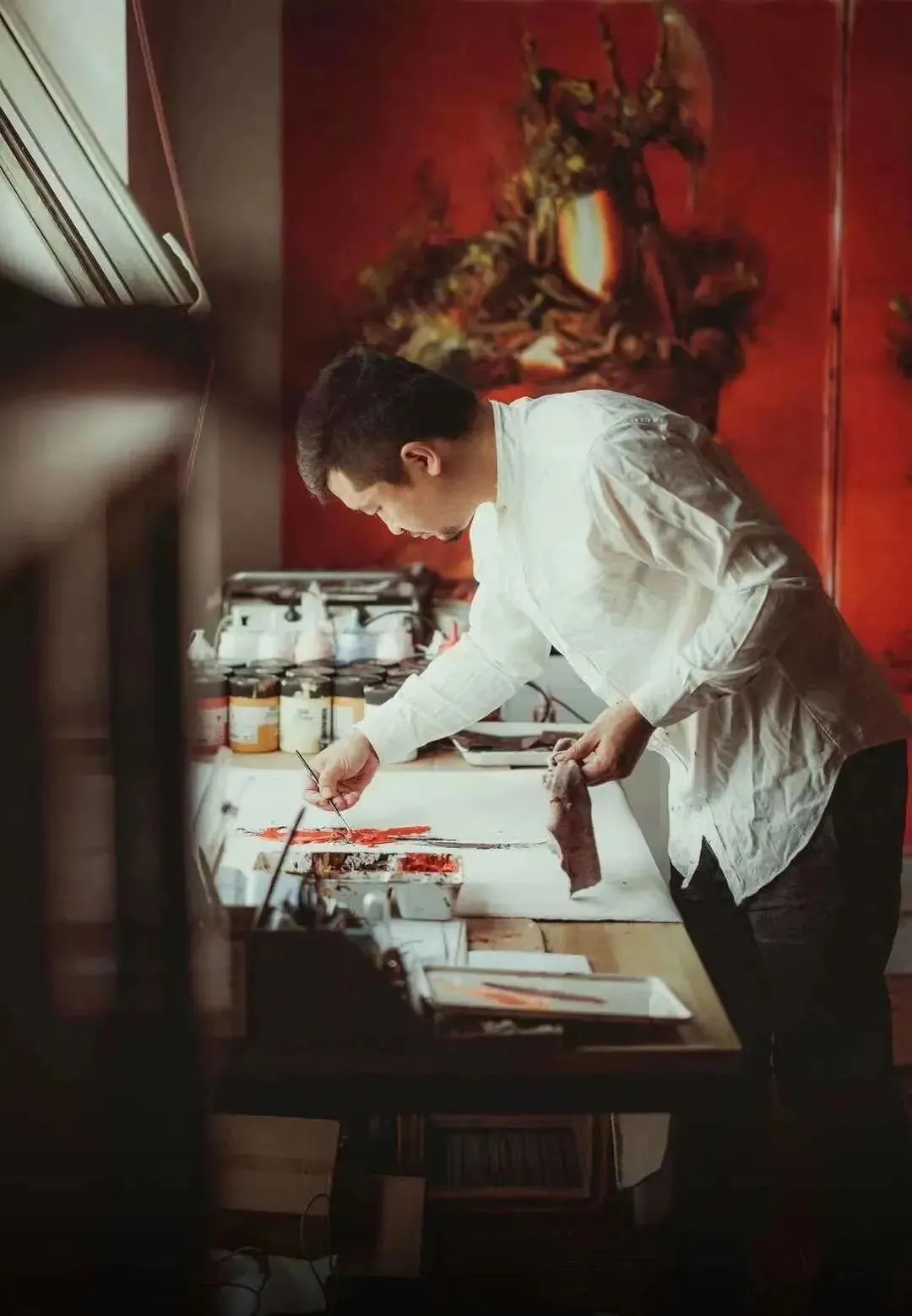 What is most compelling about Deng Yu's artistic practice is the immediacy and sincerity of his creative process. This quality elevates his work beyond static imagery, turning it into a fluid, embodied spiritual ritual. Deng Yu often uses a "bamboo pen" of his own making as a performative tool — a tense, dynamic dance between body and paint. The brushstrokes, executed in one breath, are explosive in their energy, while the splattering and flowing of paint are filled with unpredictable chance. This mode of creation carries a raw, untamed power, allowing viewers to intuitively feel the surging will of life in the very process, even before seeing the final outcome.