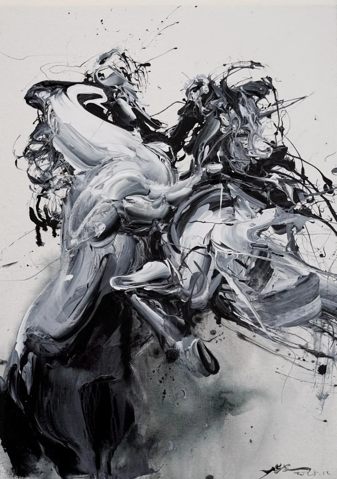 另外,同为来自东北地区的艺术家邓宇(画语者)的个展将首次呈现宁波地区。在展览中,我们将呈现出艺术家三十余幅不同时期、不同媒介的作品。邓宇的艺术实践,以“马”为核心线索,构建了一条从具象到意象、再走向抽象的完整精神轨迹,最终落脚于对“神”而非“形”的捕捉。从早期对马的骨骼肌理与外在结构的深度研习,到之后的以大写意笔墨释放动势与气韵,再到完全以书法性笔触进入抽象,他的创作始终在不断挣脱形式枷锁,让马从具象的动物形象逐渐转化为一种精神性的存在。