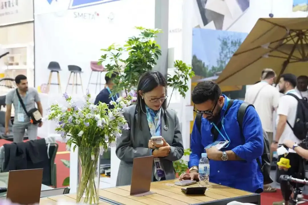 展位内搭建了实景体验区,让客商直观感受户外家具的实际摆放效果;现场循环播放自动化产线画面,增强供应链可信度。去年秋交会推出的二维码查询系统在本届继续迭代:每件样品对应唯一二维码,扫码即可调取规格、材质、包装、装箱量等信息,并关联同系列或相似款式。这一细节大幅缩短了客商的选品时间,也让数字化服务真正服务于交易效率。