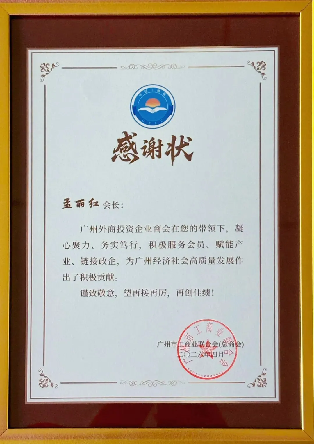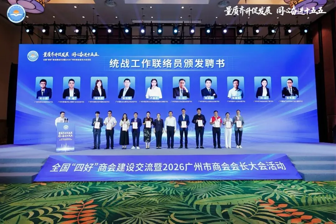 4月22日,全国“四好”商会建设交流暨2026年广州市商会会长大会活动在广州长隆国际会展中心举行,会上发布商会培育措施,颁发统战联络员聘书并公布“四好”商会建设优秀案例名单。其中,我会申报的《立足湾区寻商机,放眼世界谋发展》入选广州市“四好”商会建设优秀案例;我会常务副会长兼秘书长卢建彤获聘为广州市工商联商协会统战工作联络员。