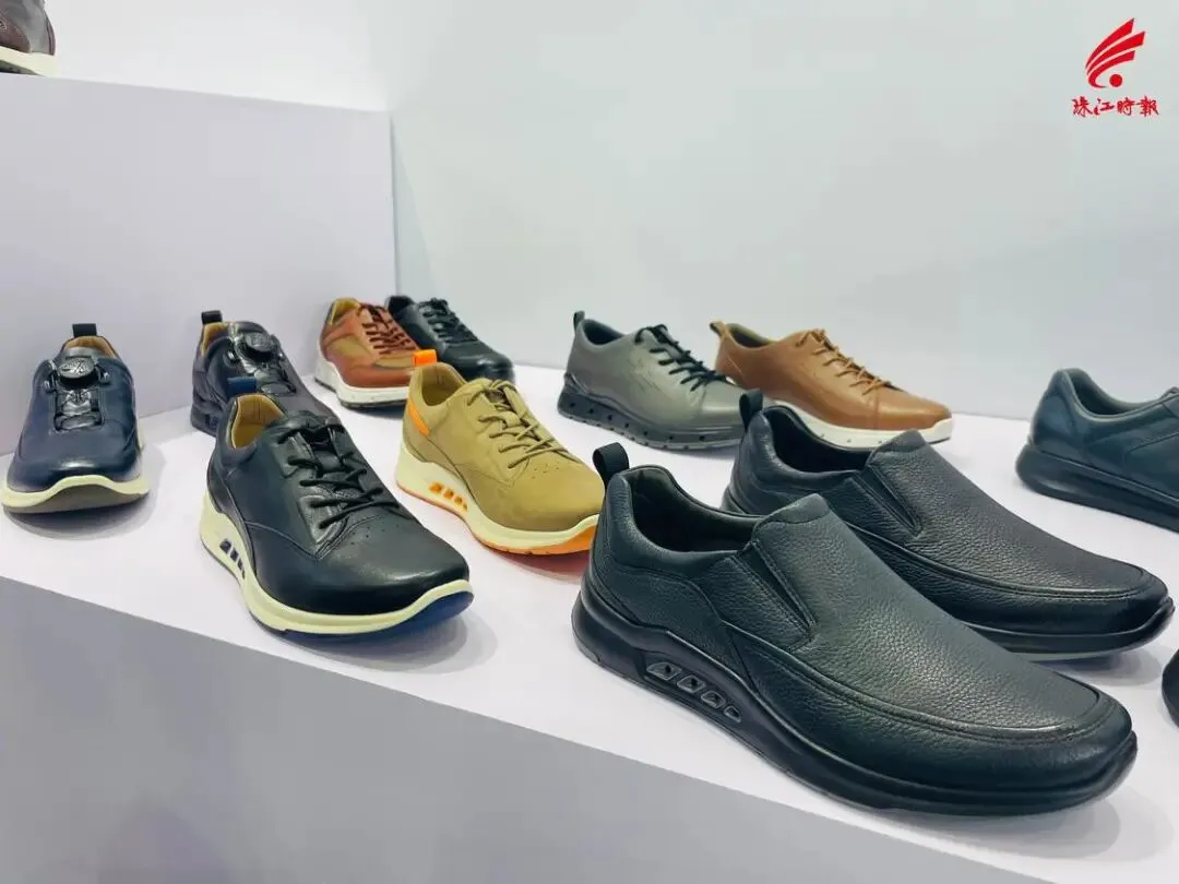 广东足迹鞋业有限公司展出的产品。 另一边, 广东辛迪丹顿鞋业有限公司也同样受到采购商的青睐。“今天上午连续接待了十几波的客人,忙到下午1点多才有空吃午饭!” 面对展会客商如潮,辛迪丹顿鞋业业务经理赵登平显得十分忙碌,第一天接待了来自亚洲、非洲等地的新老客户。 据介绍,辛迪丹顿鞋业是一家高端商务与休闲鞋的生产企业,长期为“GEOX健乐士”“HUSHPUPPIES暇步士”等国际品牌提供设计、工艺、制造等综合服务,公司拥有联邦注塑一体成型核心技术和工业4.0机器人智能制鞋生产线,通过科技打造更精湛的制鞋工艺,坚持选用德国BASF生态原料制鞋的环保理念,制造出舒适自然的高品质皮鞋。