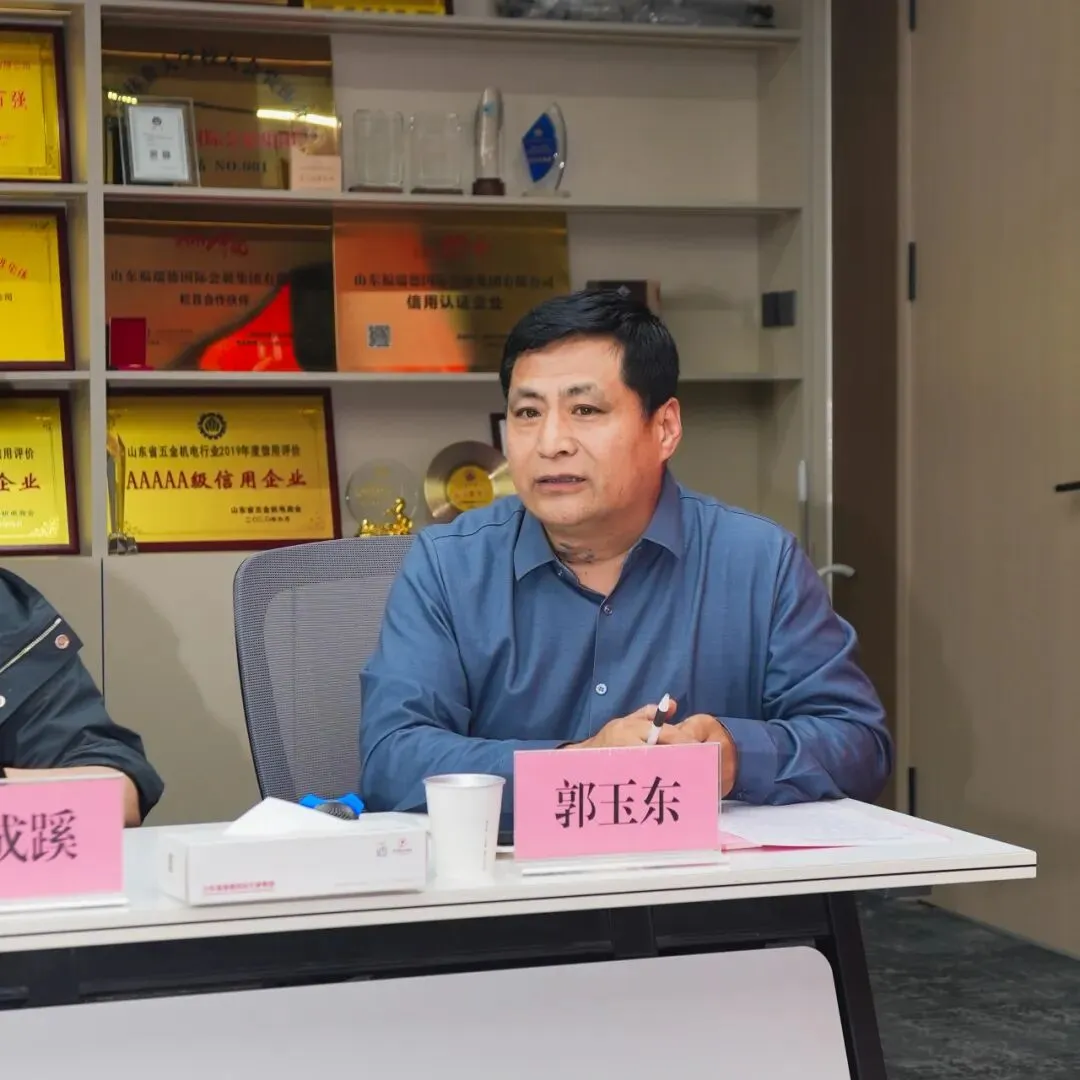 当日下午,考察组在结束对临沂国际会展中心的调研后,专程来到山东福瑞德会展有限公司进行实地考察。考察组一行参观了公司办公区,集团副总经理郭玉东向各位领导详细介绍了集团的发展历程、产业布局和经营理念等。