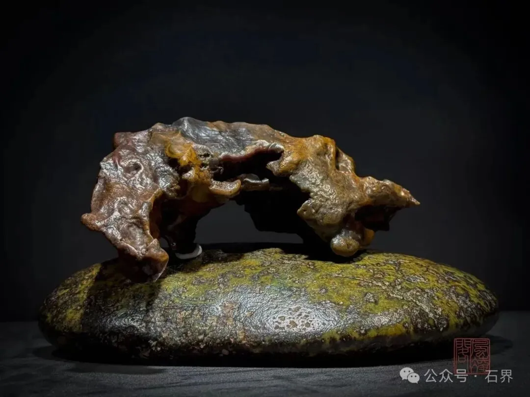 其“形、质、色、纹、韵”皆出自然,无需人工雕琢,便已是浑然天成的艺术珍品。其中,戈壁玛瑙晶莹剔透、色彩斑斓;沙漠漆以金黄漆皮、温润如玉而备受推崇;戈壁老皮的沧桑质感,更展现出大漠岁月的厚重韵味。近年来,随着戈壁石资源的逐渐稀缺以及生态环境保护的深入推进,精品戈壁石愈发珍贵。造型逼真、皮色一流、品相完好的戈壁石,已成为赏石收藏领域不可多得的稀缺资源。此次展出的30余件藏品,涵盖戈壁玛瑙、沙漠漆、蒙古眼睛石、战国红等多个品种,既有象形生动的“动物”“人物”,也有意境悠远的“山水”画面石,每一件都堪称精品。龙龟 | 蒙古眼睛石
