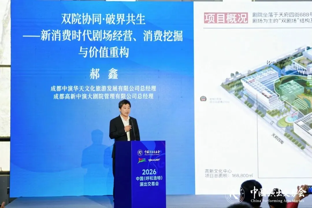 在作为2026中国演出交易会系列重要会议之一的第九届全国剧场大会上,四川省演出娱乐行业协会理事、副秘书长、成都中演华天文化旅游发展有限公司总经理郝鑫以《双院协同·破界共生——新消费时代剧场经营、消费挖掘与价值重构》为题,与参会嘉宾分享了“坚持以演出为核心、提升运营质效、深化多元经营、挖掘消费潜力、赋能城市发展”等方面的实践。